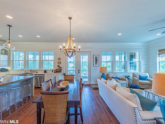 Fabulous canal front home on Ono Island featuring all the bells and whistles to make this your perfect island retreat. The spacious and open floor plan makes entertaining and relaxing a breeze. The pristine kitchen with stainless steel appliances, quartz counter-tops, large island with bar seating flows into the dining/ living area which features gorgeous ship lap walls, high ceilings and beautiful hardwood floors. The living area extends into a very spacious screened in porch perfect for lounging around overlooking the canal front views. Enjoy the fenced in backyard, private beach and dock with boat lift. There is plenty of space under the house for parking and storage.