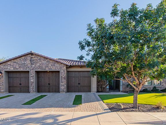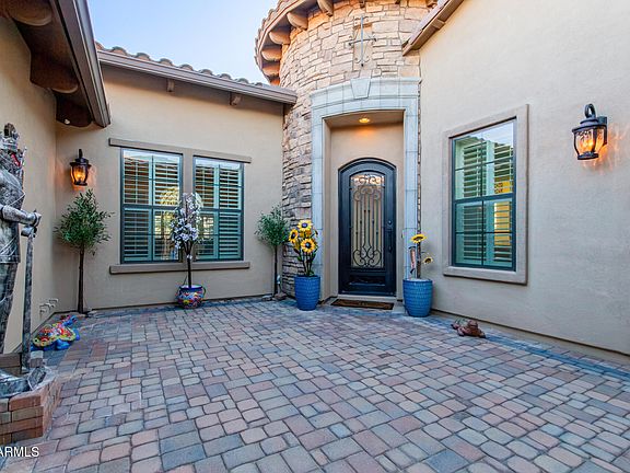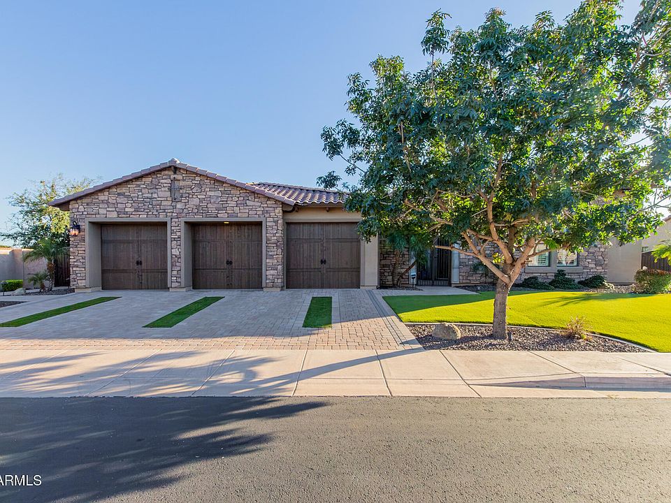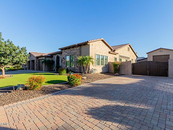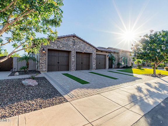 Your dream home is finally within reach! This beautiful estate welcomes you with a 3-car garage, 51 foot RV garage with 1/2 bath, RV gate, elegant pavers, an eye-catching stone facade, and an inviting courtyard. The gorgeous interior showcases a captivating open layout with soaring ceilings, recessed lighting, sleek window covering, features a custom built-in entertainment center with integrated lighting, a 75'' Dimplex electric fireplace, perfect for cozy movie nights or entertaining guests, exquisite wood-look flooring. The stunning chef's kitchen features a breakfast nook, granite counters, chic pendant lighting, a striking tile backsplash, custom wood cabinetry with crown molding, high-end stainless steel appliances, a walk-in pantry. The luxurious primary bedroom boasts direct backyard access, classic plantation shutters, a lavish ensuite with double sinks, a make-up vanity, and walk-in closets. Imagine enchanting evenings in the lovely backyard, which offers spacious covered patios, pristine artificial turf, a sparkling heated salt-water pool, and a separate 51 foot RV garage, perfect for a workshop or additional storage. This gem will sell fast! Act now before it's gone!
