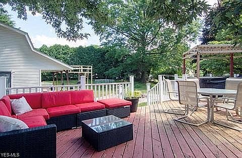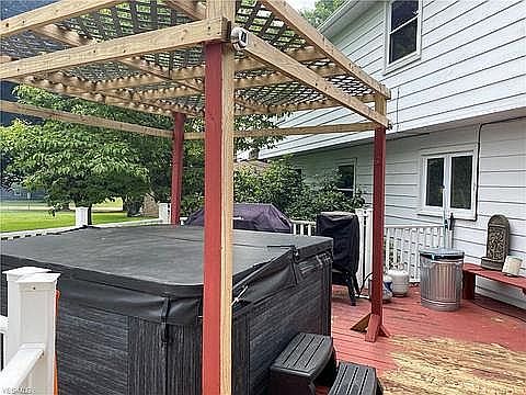 Room to Roam in this Spacious 4 bedroom 2.5 bath Colonial in Cheery Acres. Quality throughout this home starting with the crown molding in the extra large living room with gas fireplace. To the dining room also with crown molding and chair rail. 3 of the 4 spacious bedrooms feature recently refinished hardwood floors. Lower level features a huge workshop/craft room. Tons of built ins for storage. Moving to the other side of the lower level, you'll find a rec room and kitchenette. Imagine the parties you can serve from down here or family gatherings. Need space for the big toys? Check out the large 2 story storage building with loft for storage. Features electric, plank wood floors, and a covered patio area. If that's enough to make you want to stop and catch your breath, relax in the hot tub situated on the large freshly stained deck with vinyl railings for low maintenance. City water and Sewer on a Cul de sac, what are you waiting for? 330-858-7014 for more information. cable hookups thru-out. New Security system. New wood laminate flooring creating a great look and easy clean up.