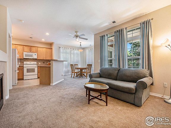 Welcome to this bright and airy corner unit located on the first floor in Broomfield. This two bedroom two full bathroom condo features brand new carpet, a private back patio, gas fireplace, primary bedroom with large attached bathroom, soaking tub, double sink vanity, and large walk in closet. After parking in the oversized two car garage, you will walk through the beautiful courtyard leading right to the front door! Location, location, location this condo is just down the street from the Orchards shopping center, grocery stores, restaurants, and easy access to I25!