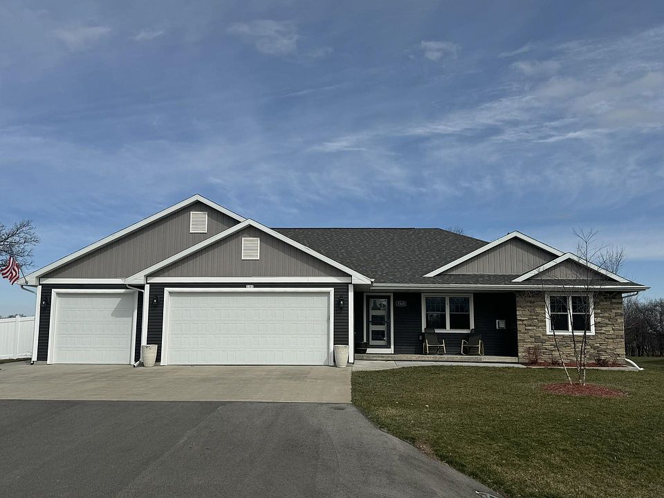 Located in the idyllic Town of Algoma! This 4 year old Parade Home was built by Prairie Stone Homes was purchased in Fall of 2019. This beautiful ranch has many upgrades, some which were done the past 2 years. Finished heated 3 car garage, granite counter tops, upgraded appliances, egress window, (2k of lumber in basement) professionally landscaped yard with large trees, huge stamped concrete patio with footings that runs around the entire back of home, Gazebo and fence summer 2023.