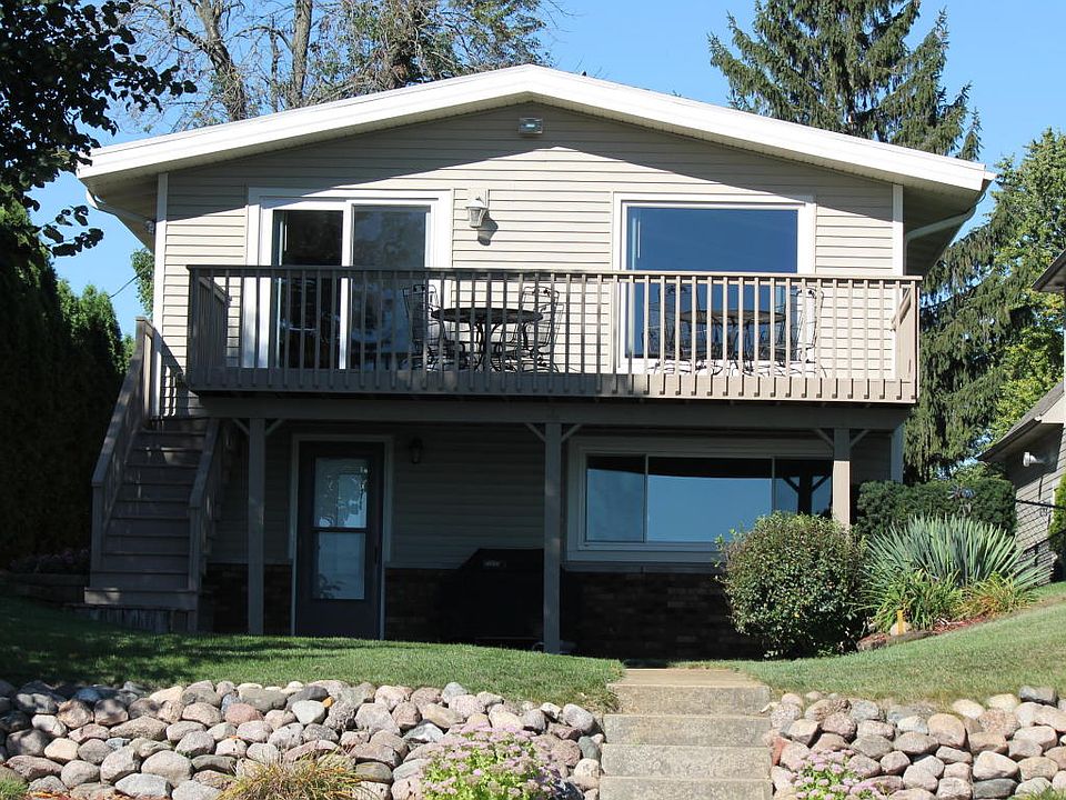 Enjoy the sunrise and expansive views from your lakeside deck. This lake home has 5 bedrooms, 2 full baths, 2 car attached garage and an additional 2.5 car garage for your boat. Your main floor is open concept with updated flooring. Exposed finished lower level includes a living room, 2nd kitchen and full bath. Walk across the street to the golf course. The maintenance free exterior will give you more time to enjoy the lake!