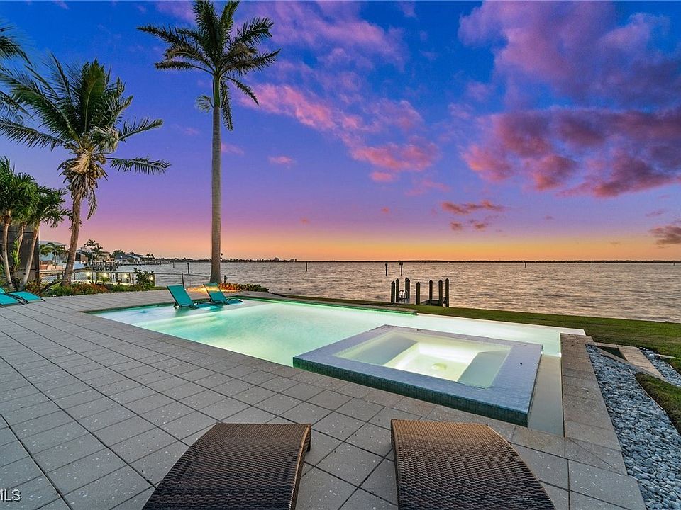 Breathtaking panoramic views of the River take center stage from this amazing RIVER front property. Home HAS NEVER FLOODED and has transferrable flood insurance policy (now $3100/year). Located in the prestigious and QUIET Palaco Grande neighborhood. Convenient to everything in the Cape or Ft Myers since it's just over a mile from the Midpoint Veterans Bridge and Veterans Pkwy. By boat, you're just minutes to the Gulf. Solar panels (paid for) provide cheap energy averaging $64/MONTH, powering both home and owners' 2 electric vehicles. When you walk in the front door you will immediately be drawn to the spectacular views of the river. Remodeled with the latest finishes to provide an open, bright and airy environment. $200K renovation plus new pool and spa. Almost everything in the home is new. The gorgeous oversized vanishing edge saltwater pool/hot tub with romantic LED lights. Extra touches like "rain drop" glass doors. Blue tooth controls on many items. Widened driveway. Beautiful pavers including "Artistic" brand sea shell pavers on pool deck. Plus you'll love the low maintenance Zoysia grass known for being eco-friendly, pest and disease resistant, and low water requirement. A detailed features list is available. AGAIN THIS HOME HAS NEVER FLOODED!