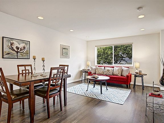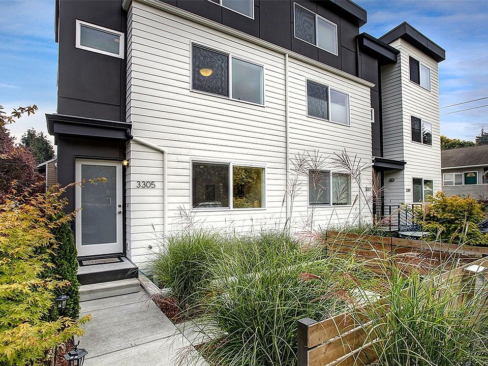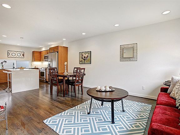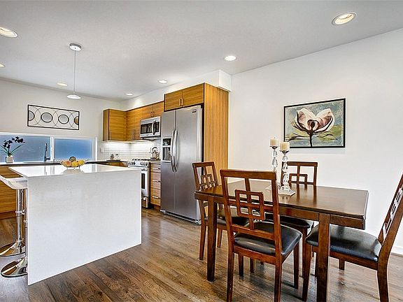 Clean, modern design townhome features an open concept living area with hardwoods and rare main floor entry. Chef's kitchen with large island, pantry, quartz counters, high-end SS appliances and gas range. Tranquil full-floor master suite complete with walk-in closet, private balcony w/ views, and spa-like ensuite bath boasting double sinks and glass tiled shower. Two 2nd-floor bedrooms and full bath make for easy home office/guest rooms. High-efficiency hydronic heating and low flow toilets save money on energy bills. Garage with custom built-in storage. Relaxing patio/garden space to enjoy the cherry blossoms. This tree-lined street has convenient access to the Village, shopping, restaurants, and trails. Welcome Home!