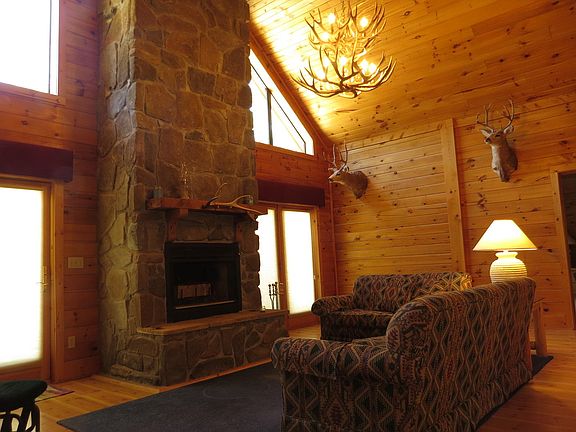 Fantastic layout in this classic 3 bedroom 3 bath log home surrounded by tall pines on 35 acres. Vaulted tongue and groove ceilings. Towering rock fireplace in great room. Finished basement area for your bar or game/theater room. 2 drive-in garages plus a stand alone oversize two car garage. Turn key with all appliances, furniture, lighting, water tap, cisterns, septic and power. Baseboard hot water heat. 1920 square feet of living space upstairs including loft and approximately 1,000 square feet of living space with wood burning stove, bar, kitchenette and bathroom downstairs. Huge back deck for entertaining! Wired for backup generator if needed. $395,000