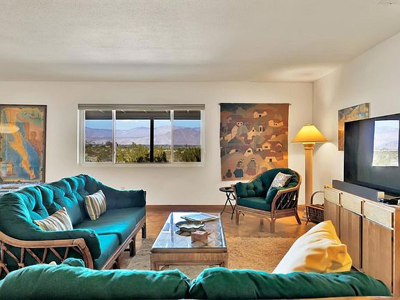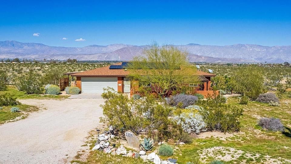 Nestled in a secluded cul-de-sac, this exquisite property offers unparalleled privacy and breathtaking views of the Borrego Valley. This 3 bedroom, 2 bath home is situated on 0.55 acres with an additional adjacent 0.57-acre parcel included in the sale, totaling a generous 1.12 acres. Step into the spacious living area and the open kitchen which features an island, perfect for culinary adventures and entertaining guests. Experience outdoor living at its finest with a covered back patio and front pergola area adorned with custom flagstone, providing the ideal setting for al fresco dining and relaxation. The professionally landscaped grounds boast a custom flagstone fire ring, adding warmth and charm to outdoor gatherings. Enjoy the benefits of owned solar and RV electric hook up, offering energy efficiency and convenience. This property is a haven for nature lovers and outdoor enthusiasts alike, offering the perfect blend of tranquility and setting.