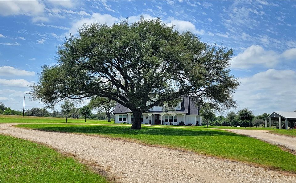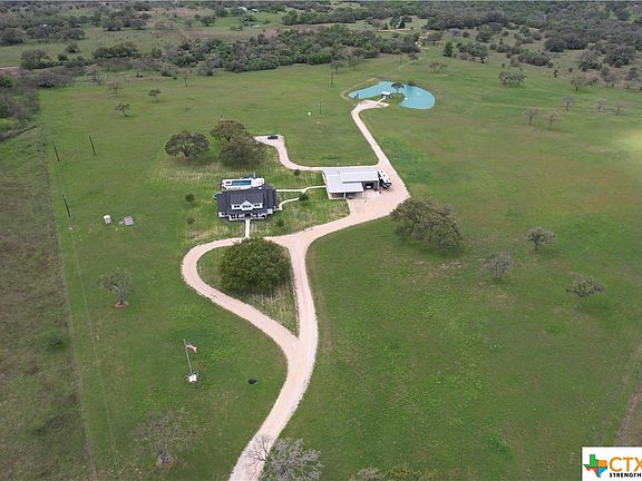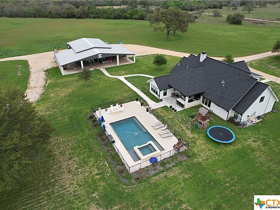 Absolutely beautiful property, a rare find in the area. Has it all, gorgeous new custom home, fenced-in pool, shop, acreage, and stocked pond with a building with 1/2 bath. Every detail was attended to when creating this 1 of a kind home. Has 5 bedrooms and 3 baths on the first floor and a bonus space and extra large bedroom and bath on the second. 2 on demand gas water heaters, custom and electric shades, 8' doors, 2 water wells, acres of irrigated carpet grass, 2 septics, buried 500 gallon propane tank, commercial water softener are a few of the extra touches that make this place amazing. Smart features throughout the home. The immaculate shop with 1/2 bath has parking for several vehicles plus toys and still plenty room for entertaining. The pool and hot tub are both gas heated as well as the firepit, buried 500g propane tank. Cool decking around the fenced-in pool. The outdoor patio includes a gas fireplace, flat top grill and pellet grill. 2 hrs to SA, Houston, Austin, or CC
