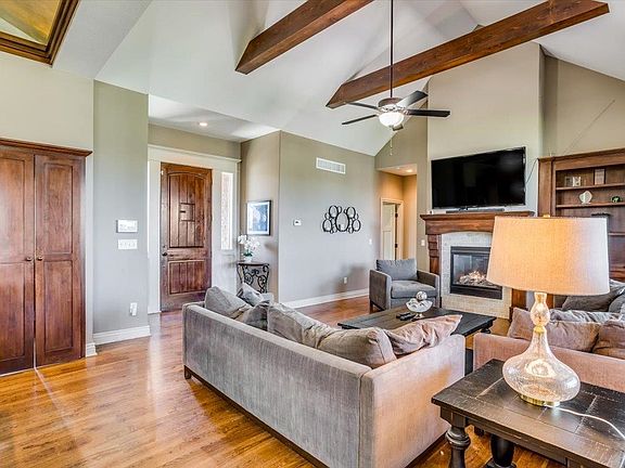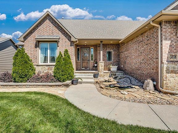 This fantastic home showcases a popular bonus room plan with stunning features, spacious open living areas and is located in the Fontana subdivision and Maize School District! The front elevation and entry are impressive with beautiful stone and brick accents complimenting the Koi Pond and landscaping. The front entry opens to the spacious living room with a gorgeous, vaulted ceiling, wood beams and fantastic oversized windows providing wonderful natural lighting. The living room also includes a gas fireplace with tile and custom wood accents, and true wood floors. The living room is open to the kitchen and dining area with a gorgeous faux-painted barrel ceiling and indirect lighting. The kitchen and dining space are perfect for family gatherings and entertaining and feature gorgeous rustic beech cabinets with under-cabinet lighting, and a hidden walk-in pantry. Retreat to the primary suite featuring French door to the primary bath that include his and her vanities, a huge walk-in shower, soaker tub, separate linen closet and private lavatory. The primary suite closet has amazing space with organized extra storage for seasonal clothes, separate shoe storage and is adjacent to the main floor laundry room. The garage entry to the house includes a great drop zone with space for hanging jackets and coats, shoe baskets and even an upper cubby area. The second main floor bedroom also has great space with an adjacent bathroom with tub/shower and granite-topped vanity. And then….the awesome bonus room is so spacious and includes an angled ceiling and a private, full bathroom with granite-topped vanity and a large walk-in closet. The full, walk-out basement has incredible family and entertaining space with a beautiful, large family room including a striking stone and brick-faced gas fireplace, and a mounted electric screen and projector. The finished basement also includes a fantastic recreation/game table area and an awesome wet bar with tile floor, bar counter for bar stools, great cabinet storage, granite lower and upper bar counters, full-size refrigerator, dishwasher, wine rack and kegerator. The viewout/walkout finished basement also includes 2 additional bedrooms or offices, full bathroom with tub/shower, and a storage room. The large, outdoor patio area has great space to enjoy with family and friends. This gorgeous home showcases the beautiful water views from the entry and continues throughout the entire home. Enjoy this fantastic home, located in a great neighborhood, with easy access to highways, schools, shopping, and dining!