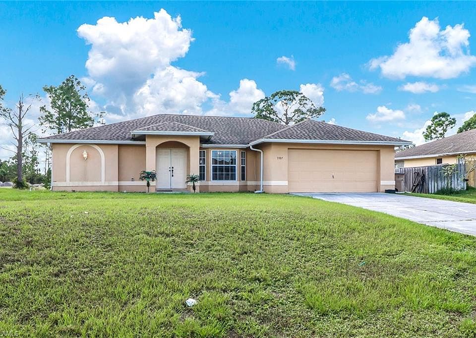 Southern rear exposure 3 Bedroom 2 bath home in fast growing South West Lehigh Acres for sale. Don't wait to build when you can move right into this home in an established neighborhood. This home is conveniently located near the intersection of Lee Blvd and Sunshine Blvd South, with easy access to Fort Myers and I-75. This home features a split floor-plan, with master and guest bedrooms on opposite side of the house for privacy. The large open kitchen is perfect for gathering with family and friends. Lots of counter space with plenty of cabinets and a large pantry for storage. The high ceilings in the living and family rooms make this home bright and open. The generous covered lanai is under truss, giving you a great place to enjoy the weather.