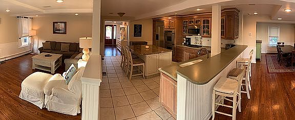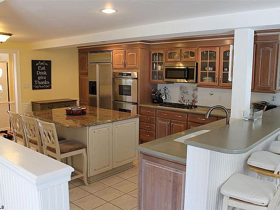 Spacious 4BD/3BA Longport home on a corner lot, just one house from the bay, with gorgeous water and sunset views! Built for hosting, a large entry opens to a granite kitchen with ample counter space and an over-sized island. Pull up a stool at the breakfast bar, or spread out to seat 10+ in the large dining area. The kitchen also opens to the family room, with sliders out to a private back yard space. A large bedroom and full bath on the first floor make it easy for two families to enjoy the summer together. Upstairs, two more large bedrooms - both with water views - share a full bath and private porch. The master suite sits at the back and features vaulted ceilings, ensuite with glass shower and Jacuzzi tub, walk-in closet, a separate work/office space, and a balcony that overlooks the bay. Additional amenities include a fireplace with fieldstone surround, a first-floor sun porch can be used as additional office space, large walk-in pantry, high-ceiling garage for oversized car, off-street parking for 4 cars. Garage also offers heated floors for an additional work space, outdoor shower, racks for water toys, and more! Location is an easy stroll to both the beach and the Margate Marina district. Are you ready to play on the bay and catch endless sunsets?