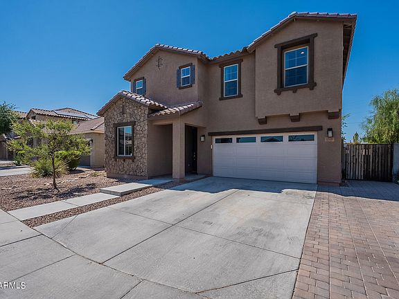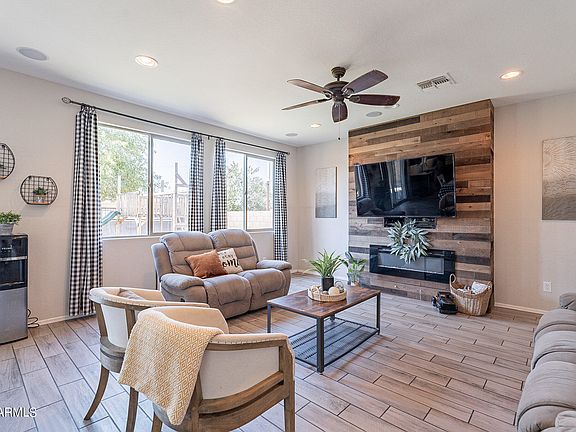 Beautiful 5 bed 3 ba home in GATED Lehi Crossing in Mesa! Popular open floor plan w/ kitchen open to dining space and great room w/ fireplace feature wall, perfect for entertaining! Kitchen offers espresso cabinets, SS apliances, granite coutners, center island w/ breakfast bar & tile backsplash. Bedroom & bath downstairs, perfect for guests! Upstairs you'll find the spacious master suite w/ walk-in closet, dual vanity, and step-in shower + generously sized secondary bedrooms & full guest bath. Upgraded wood look tile flooring, modern neutral paint t/o. Backyard features custom pergola + covered patio, shed, and turf yard. Great location on a PREMIUM N/S lot w/ no rear neighbors!