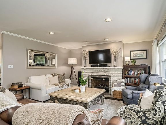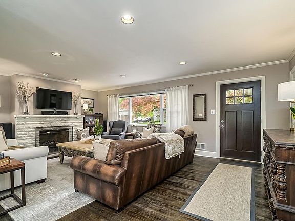 Wow! The remodeled kitchen with stainless appl, new cabinets including large pantry, granite, tile backsplash, breakfast bar with stools is open to the dining room with new chandelier and French door leading to the large deck. Dark stained hardwoods throughout main level. Updated white trim and doors. Two fully updated baths! Large living room with fireplace and abundant natural light. Two closets in owner's bedroom. Nicely finished lower level room with barn door, a TV connection wired into the wall, and room for multi-purpose space. Additional finished room with fireplace and closet (could double as an unofficial bedroom). Large alcove in garage provides extra storage. Park-like backyard with shed, fire pit, and deck. Walk to all schools, shopping, restaurants. Agent related to sellers.
