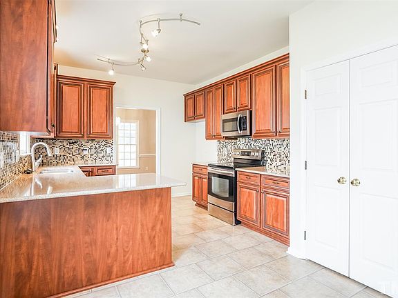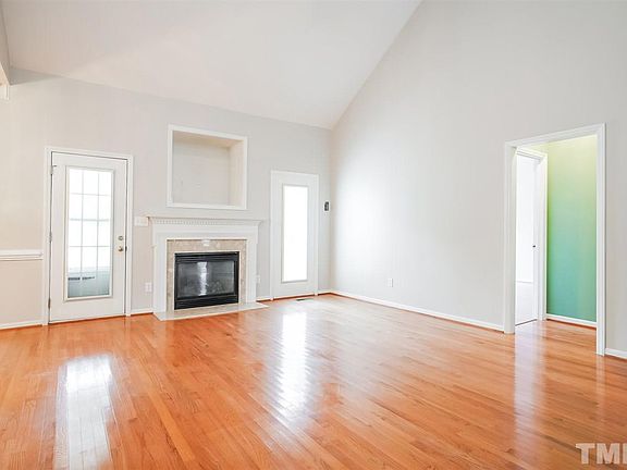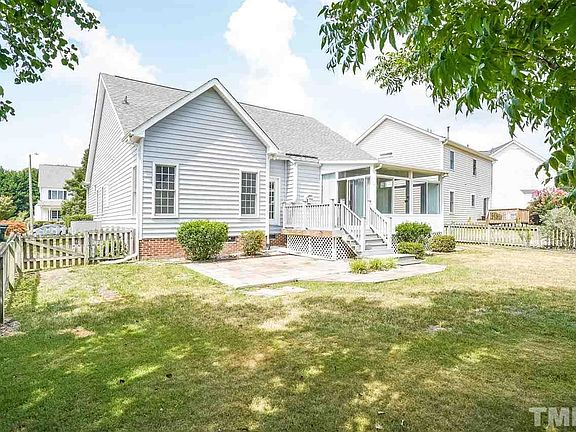 This Raleigh one-story cul-de-sac home offers hardwood flooring, stainless steel appliances, granite kitchen and master bath countertops, a deck, patio, and a two-car garage.