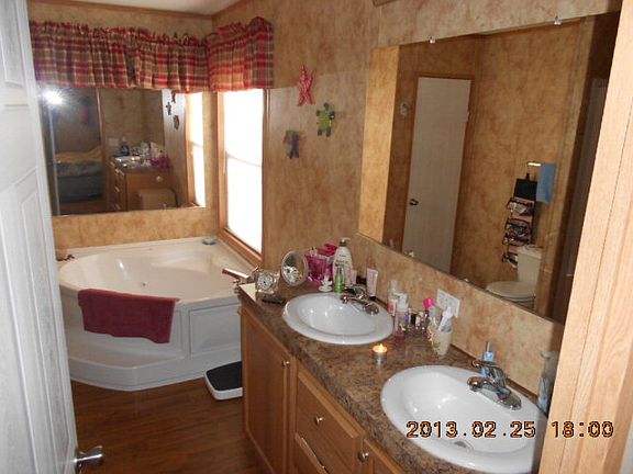 Very tidy doublewide on over 2 acres. Good floorplan with a living and family room. Large country kitchen has tons of cabinets and countertop space. Enjoy a pantry too. Master bedroom has a great master bath with a soaking tub and separate shower. 2 additional bedrooms and bath. The detached garage is perfect for cars, hobbies, storage and more. Good condition and it won't disappoint your buyer