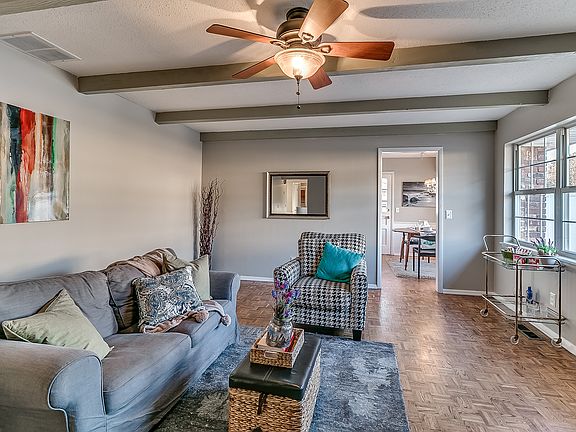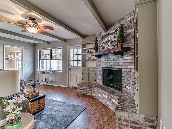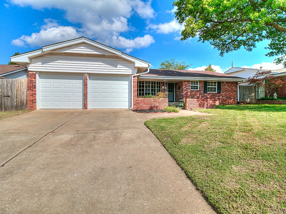 This cute 3 bed two bath home is ready for a new owner. Front room is versatile serving as a large second living room or a combination formal dining and formal living room. Back Living room features a corner wood burning fireplace whitewashed brick hearth and built in storage and display shelves, exposed beam ceilings and durable parquet floors. Kitchen has lots of counter space and storage and adjacent eating area. Large bedrooms and re-tiled tub/shower surrounds and faucets. New carpet in bedrooms and re-tiled bathrooms. Great curb appeal with flower beds and mature shade trees. Just around the corner from Mid-Del's Cleveland Bailey Elementary.