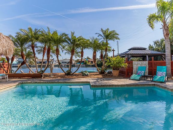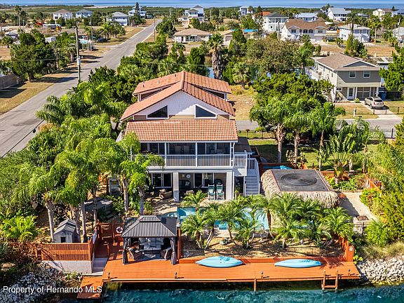 UNIQUE KEY WEST STYLE HOME that has the MAJOR WOW FACTOR! Truly a TROPICAL PARADISE in the Quaint Coastal Community of Hernando Beach! Double Lot (fully irrigated) has 151 Feet of Water Frontage with a RESORT STYLE BACKYARD that is Very PRIVATE & Set up for Entertaining Family & Friends. Seller is putting on a NEW TILE ROOF for Better Insurance Rates. It is Definitely 5 O'Clock Somewhere in the Tiki Hut Bar & Outdoor Kitchen (Roof is a Full Rubber Membrane)! Swim in the Salt Water 2011 POOL Adorned with Pavers & Gorgeous Palm Trees. Follow the Path to the Private Outdoor Shower after your Refreshing Swim. 800 Ft of Outdoor Covered Space. Watch the Colorful Sunrise, Read a Book, Enjoy Your Favorite Morning or Night Time Beverage Waterside Underneath the Covered Aluminum Gazebo on the Deck/Dock. Kayaking, Paddle Boarding or Boating.. 50 Ft Dock with Steps to the Water. At Night Time: Mood Lighting, Hot Tub, Firepit at the Mini Beach & Coastal Warm Breezes. Need Storage? 28x14 ft Aluminum Shed with 2 Windows & 2 Windowed Double Doors.. Raised, Anchored & Rated for 170 mph winds. Step Through the trouble free Aluminum Gates to this Beautiful Three Story Home with Cement Hardy Board Siding & 2007 Barrel Tile Roof. Volume Vaulted Ceilings & Transom Windows for Natural Lighting in the Great Room with 2 Newer Sliding Glass Doors going out to the Back Covered Screened Deck Overlooking Paradise aka Your Backyard & Pool. If you Like to Cook.. You are going to really like the Remodeled Kitchen with Breakfast Bar with Stools, Luxury Granite Counters & Backsplash, Double Sized Refrigerator & Freezer, Soft Close Wood Cabinets with Some Upper Glass Front Doors, Under Mounted Stainless Steel Sink with Pullout Spray Faucet, Double Oven, Metal Cutting Board & Rolling Island. Third Level of this home offers a Small Loft & the Primary Suite with Remodeled Bathroom with Individual Heater, Dual Sinks, Granite Counters, White Wood New Cabinet, LED Mirrors with Light & Walk in Shower, Walk in Closet Plus a Deck with View of the Gulf & Amazing Sunsets. Second Level Bedroom has crown molding & Remodeled Bathroom also with Granite Counters, New White Wood Cabinet, Mirror & Tub/Shower Feature & Individual Heater. Inside Laundry Room with Commercial Grade Speed Queen Washer, Dryer & Cabinets plus a Hidden Ironing Board. In-Law Studio Style Suite is perfect for Guests or if you wanted to make this a Vacation Property as there is NO RESTRICTIONS for SHORT TERM RENTALS. Located 5 minutes from the Community Boat Lift that takes you to the Salt Side & The Gulf of Mexico. 2024 Pool Pump, 2022 HVAC System 2015 + 2020 Electrical Panel Boxes & 2016 On Demand Tankless Water Heater, Whole House Filtration & Saltless Water Softening System, Dimmable LED Lighting throughout, All Schlage Electronic Push Button Entry Door Locks, Smart Phone Remote Access Nest Thermostat with separate room sensors for individual room temperature control & More. FEEL LIKE YOU ARE ON VACATION... EVERY... SINGLE... DAY...!
