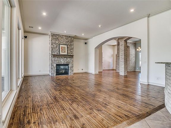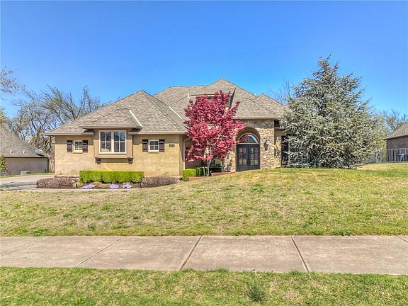 Calling all nature lovers! Beautifully maintained home on nearly .5 acre wooded cul-de-sac lot. A peaceful setting w/ expansive outdoor living space-backing to mature trees/creek. Lg covered patio featuring fireplace, Blt in grill-infratech heaters-extended patio w/ additional fireplace & outdoor paved patio-lit stairs leading to lower large yard. Stone arches-wood floors-curved eating bar offer great character to this spacious home. Chef's kitchen features double ovens-Maytag dishwasher-island-huge walk in pantry & bev/serving wet bar. Retreat to the secluded master suite & oversized spa bath with 2 vanities + seated vanity-LG jacuzzi/whirlpool+walk in shower, huge wardrobe closet + out of season pull down. Lower level:2 secluded guest suites w/ jack/Jill bath-4th bed/media room up. Crazy abundance of storage. Perfect for entertaining inside & out w/ lots of yard & space to explore. Walking/bike trail connecting to Mitch Park is at the end of the cul-de-sac. F5 Above ground shelter.