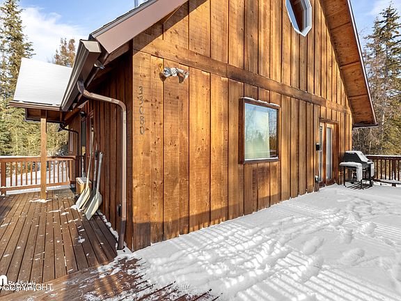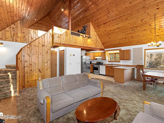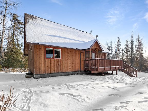 A TRUE ALASKAN CABIN W/Privacy! Everyone is looking for privacy and acreage these days, and this Chalet Style Home w/Cedar Siding checks all the boxes. Sitting on 1.07 of an acre at the top of Skyline, the home is tucked back into the woods, with a beautiful wrap around deck perfect for star gazing. Home features include: NEW ROOF Nov. 24', NEW KITCHEN STOVE, NEW FRIDGE, NEW HWH, T&G Woodwork,Several NEW Windows on main level including the octagon window, Wood stove in living area, Cathedrial Ceilings in living, and sliding glass doors to the oversized front porch. There is basement walk out access, if utilized this would make a Great Private entrance for your use or a rental, one wall in basement was left revealed for pipe access if someone wants to put in a second kitchen (this 660 sf is only counted as storage space but 90% complete). The LOFT is 1 of the bedrooms, a 2nd on the main floor and the 3rd in the basement with a full bath/shower. Laundry area is also in the basement. Property also features a 12x12 Storage Shed that stays. CALL TODAY!