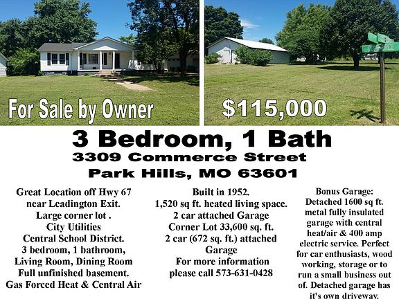 3 Bedroom, 1 bath house with unfinished basement and attached 2 car garage. 1600 sq ft Detached Metal Garage also located on the property. Fully insulated with central air/heat and 400 amp electric service. House and detached garage sits on an oversized corner lot off Hwy 67 before the Leadington exit. City utilities. Central School District.