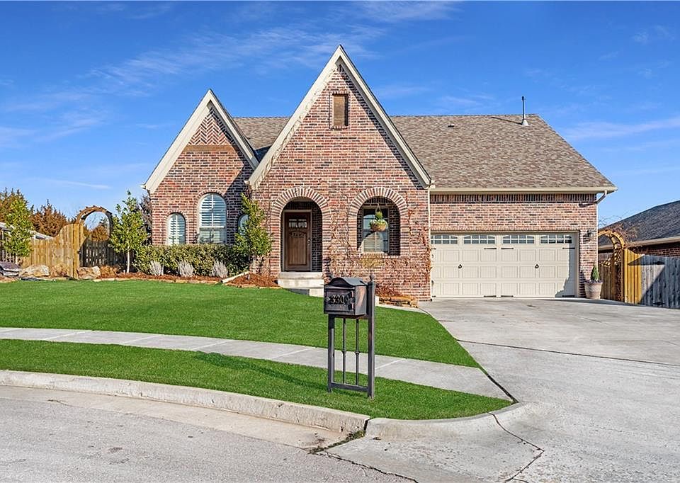 Charming Tudor style home in Edmond's popular Town Square addition. Located just west of I-35 you'll fall in love with this historic inspired community. So much curb appeal when you pull up to this well cared for lawn with upgraded sod, beautiful landscaping and archways on the windows, porch and fencing! Inside you'll find site finished oak wood floors, quartz counter tops, ship lap details, custom plantation shutters on arched windows in front bedroom, etc. This home features an open kitchen/living/dining that looks out on to the large covered back patio with a great size backyard! Town Square offers a community greenbelt, fishing pond, floating dock, paddle boats, playground, resort-style pool, state-of-the-art fitness center, youth rec center and community garden! Great location just one minute to I-35 and 15 minutes to downtown!