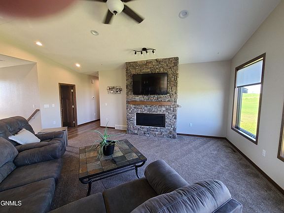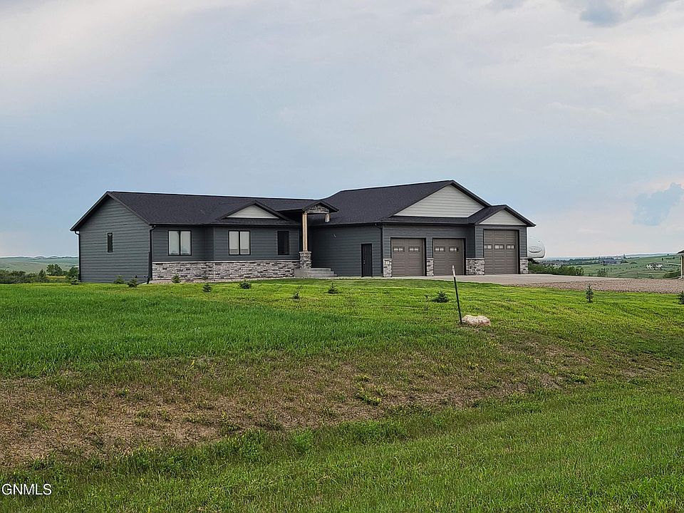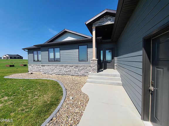 Wait until you see this spacious ranch style, custom built home. It has a 1775 square foot main floor. Basement is a walkout. The Oversized 1444 sq ft, triple stalled heated garage has an extended shop area, floor drains, hot and cold water, and wired for 220. Main floor features 3 bedrooms including primary bedroom with bath and walk-in closet. Kitchen features quartz countertops and a huge pantry. Living room has a gas fireplace. There is main floor laundry option, along with a basement laundry space. Home has open floor plan with windows, to help you experience the most amazing sunsets. There are picture perfect prairie views for miles. There are no neighbors to the west, as the property borders the Harmon Lake Recreation Area. The hard work has been completed. The lot has 150 trees planted around the perimeter of property. Backyard has rock and block landscaping with a waterfall feature. Patio is wired for hot tub, along with concrete piers for a future deck. Basement has been plumbed for a bathroom. Radon mitigation system has been installed. Come appreciate a piece of country life just minutes N of Mandan.