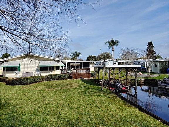 LOCATION, LOCATION is the key to this waterfront property situated in the 55+ Community of Fox Run. The 2 bedroom, 2 bathroom home sits on a park-like lot complete with a private covered boat dock and outdoor patio in your backyard. Features in this spacious and well-maintained home include a formal living room, a formal dining room, a large kitchen/family room combo, a split-bedroom plan and an enclosed Florida Room. Lots of storage inside and outside in the attached workshop/shed. Amenities abound, 2 pools, one solar heated, clubhouse, shuffleboard courts, scenic walkway, marina and park. Come see for yourself.