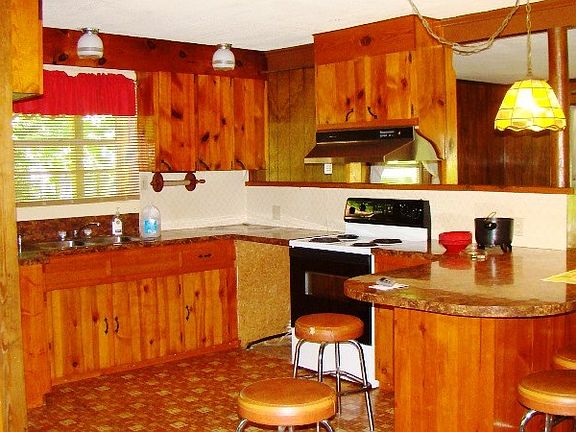 Rustic one bedroom home with 1 1/2 bath, two 2 car detached garages on 1 acre lot. Sold AS IS.