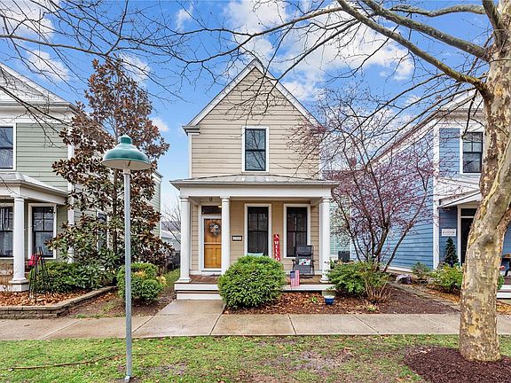 Experience the NEW TOWN LIFESTYLE in this adorable 2-story cottage! Nestled in tree-lined courtyard with detached 2-car garage. Classic curb appeal with COVERED FRONT PORCH, columns, mahogany front door with transom & upscale fiber cement siding. OPEN FLOOR PLAN with 9-ft main level ceilings, bright great room, step out to PRIVATE PATIO for fresh air enjoyment. Eat-in kitchen with wood cabinets, peninsula double sink, corner revolving storage, smooth-top stove, refrigerator stays. Main floor powder room with pedestal sink. Upstairs 2 MASTER SUITES, each with tub/shower combo. Convenient 2ND FLOOR LAUNDRY near bedrooms (newer washer/dryer stay). Other features: 6-panel doors, insulated windows & new water heater. Amenities: pool complex, beach, stocked lakes for fishing/swimming/boating, scenic parks, quaint shops, restaurants, playground, amphitheater events/concerts & more. Easy access to Highways 94/370 in AWARD-WINNING SCHOOL DISTRICT. Priced to allow for paint & flooring updates.