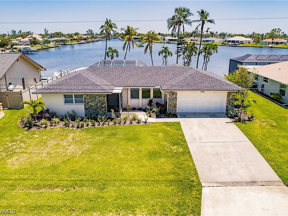 Amazing wide water basin and intersecting canal views! Gulf Access home with expansive San Carlos Basin views - see dolphins and manatees right from the back of your home. Easy access to river and Gulf of Mexico with a single bridge out. Home has many updates and is in excellent condition. 3BR 2BA 2 car garage pool home being sold turnkey. As you walk in the front door you'll see the pool and large panoramic basin water views!There is a formal dining area adjacent to kitchen and dinette area opposite kitchen. Kitchen has breakfast bar, granite countertops, tiled backsplash and plenty of cabinets. Master bedroom is very spacious with walk-in closet and updated bath with dual sinks. Walk-in closet with custom cabinets.There are two guest bedrooms with one featuring a private sitting area and door to pool. Great area for kids TV and game area. Large covered lanai with spacious sitting and dining areas. Paver courtyard which is great for grilling.Relax and fish from your own private dock. Newer roof, new a/c 2021 and pool refinished in 2020 plus new heater in 2018.Quiet neighborhood and street, convenient to Publix and downtown Cape Coral shops and dining. No hurricane damage!