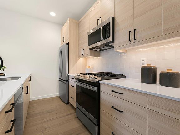 Sleek peninsula layoutRooftop deckDesigner tilePremium fixturesSpacious second bedroomCustom mirrorsCity views