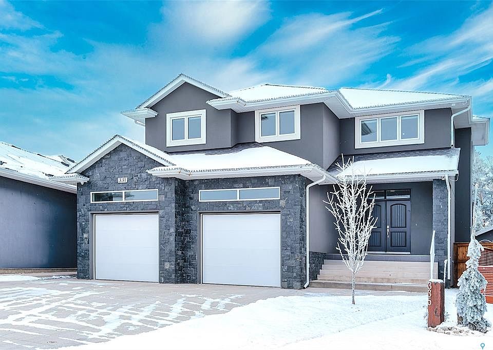 Tucked away on one of Evergreen’s most desirable crescents, this exceptional two-storey home blends luxury, function, and timeless elegance on a massive pie-shaped lot backing the walking trails lined with mature Scots pine trees. From the striking curb appeal to the timeless finishes and extensive list of custom upgrades, every detail has been thoughtfully designed. Inside, a grand foyer leads into a living room with soaring ceilings and expansive windows that fill the space with natural light. At the heart of the home, the gourmet kitchen showcases Redl custom cabinetry, built-in Miele dual ovens with induction cooktop, quartz countertops, tile backsplash, and a large island with additional seating, seamlessly connected to the dining area overlooking the private backyard. The main floor also offers a dedicated office, a 2-piece bath, and a mudroom with direct access to the oversized heated staggered bay garage ( 28’ x 22’/26’) with 220v plug and hot/cold water taps. Upstairs, four spacious bedrooms await, including a luxurious primary suite with a custom walk-in closet and a spa-inspired ensuite featuring a jetted tub and steam shower—the perfect retreat after a long day. A full bathroom and convenient second-floor laundry complete this level. The fully developed basement adds versatility with a large family room and games area, a fifth bedroom, 4-piece bath, storage, mechanical room, and a future wet bar nook. Notable extras include central AC, HRV, HEPA air filter, “hide-a-hose” central vac, Control4 audio with built-in speakers throughout, and more. Outside, the expansive backyard offers endless potential for entertaining, a future pool, or simply enjoying the serenity of your private outdoor escape. Ideally situated near the Forestry Farm and zoo, an array of amenities, school bus pick up, elementary and high schools, this rare property offers the perfect balance of comfort and lifestyle in one of Saskatoon’s most coveted neighbourhoods.