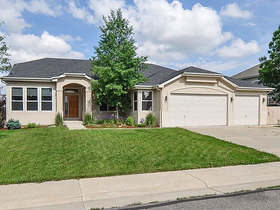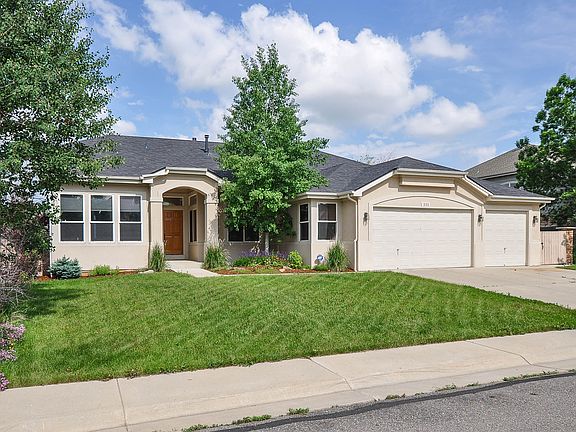 Beautiful semi-custom ranch home in the desirable Northridge community of Erie with 5 bedrooms and a home theater. You can't help but be drawn into the great room to the wall of windows. Once there you will be welcomed by a fireplace, a large eat-in kitchen, and a covered deck. Off the entry, there is an office with double doors, and corner windows opposite a formal living room and dining room. The main floor bedrooms are grouped together in a wing of the house that offers privacy from the main public spaces. The primary bedroom has access to the deck, a fireplace, 5-piece bath and a closet that is Pinterest-worthy. Bedrooms 2 and 3 share a hall bath and are both generously sized. The garden-level basement is an entertainer's dream- offering a wet bar, home theater, space to play pool, darts and cards. The second primary bedroom's ensuite bathroom has a double shower, with spa heads, and double sinks. This home was the builder's home, the curved walls in this finished basement highlight their building skills. The backyard is lovely, bordering acreage lots to the east, offering sunrise views over the pastures from the large deck. There is a built-in playset, water feature, mature trees and quiet! Low maintenance Stucco, 3 car garage, and desirable Erie zip code with lower Weld County Taxes. No HOA/ Metro District.