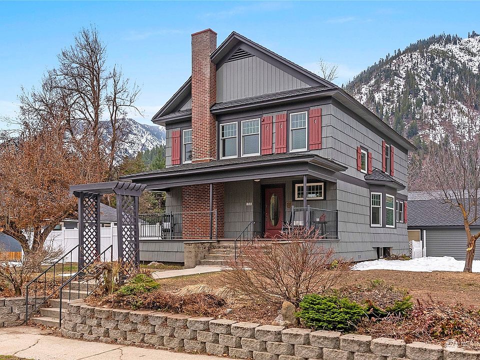 The unique Mottler Mansion stands proudly in the heart of Leavenworth. Built in 1918 to take-in the surrounding mountain views. This home welcomes with warmth & charm; it has the added benefit of being light & bright as the sun floods into the home. Gracious entry with secret Harry Potter 1/2 bath powder room. Entry leads to expansive living room with fireplace, open dining with entry to family room. Eat-in kitchen. Upstairs to 3 bedrooms & full bath. 2 bedrooms open to mountain view bonus room/study. New stairway carpet. All windows but basement are Renewal/Anderson replacement windows. Fresh exterior paint. New 50 yr roof. Attic & basement recently insulated. Fenced backyard. 2 car detached garage. Unique 3 BR 1.5 BA home.