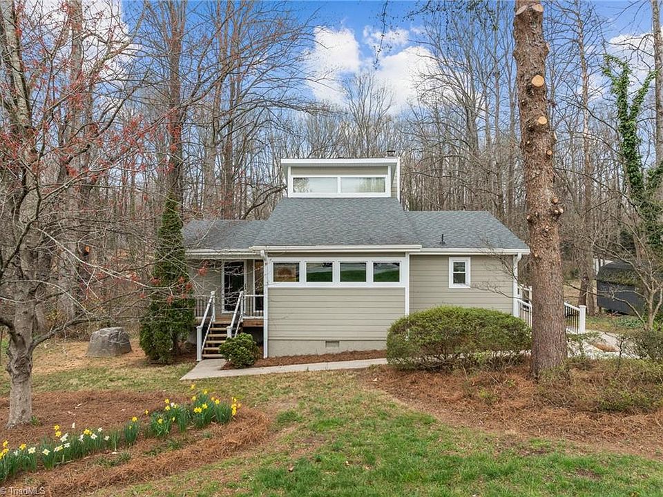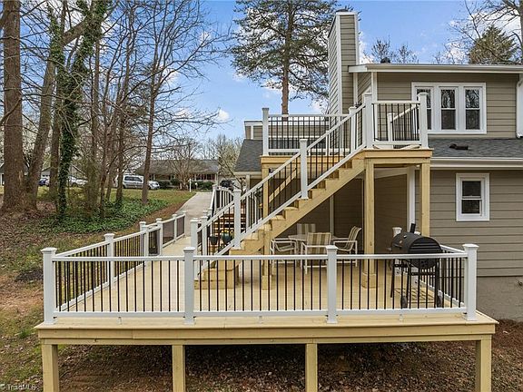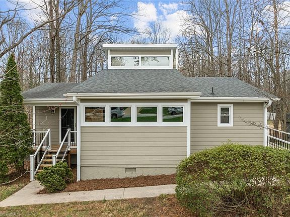 Enjoy contemporary living in the heart of Kernersville w/this rare home for sale. Meticulously maintained, the owners have spared no expense in upgrades. The kitchen is a cook's haven, new cabinetry, leathered matte granite countertops, a stunning white backsplash, flat cooktop/oven,& water-resistant flooring. In 2021, the home received a facelift w/ hardy board siding, & an expansive deck w/ views of the wooded, nearly acre-sized backyard complete w/creek. This 3-level home is thoughtfully designed. The bottom level features 3 bd & 2 ba, providing a private retreat. The middle level is the kitchen, dining, and w/d. On the upper level, there is a cozy den w/a wood-burning fireplace, creating a warm vibe. Each level connects to the extensive decking, allowing for indoor-outdoor living. The yard has azaleas, a maple tree, and dogwoods, creating a pretty backdrop. Upgrades include roof & gutters 2019, installed windows 2021,HVAC 2019 & storage building 2023. You'll be glad you visited!