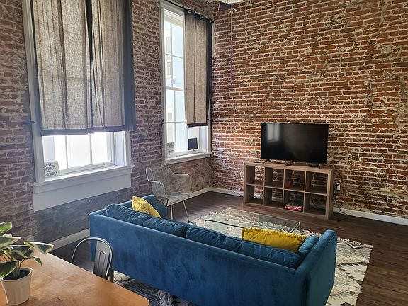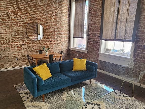 Features designer furnishings. Includes exposed brick walls, hardwood floors and large light-lit windows.