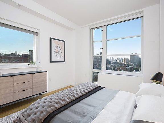 Condo quality finishes in this bright three or two bed, two bath apartment. With natural hardwood strip flooring, soaring ceilings and an open layout, this is where you want to come home. A full sized washer and dryer, top-of-the-line stainless steel appliances, including a dishwasher and microwave. The kitchen also has custom Italian satin finish cabinetry with soft-close features and a built-in pantry. The bathrooms are surprisingly spacious with deep soaking tubs and built-in grooming stations. This intelligently designed apartment has floor-to-ceiling windows and unbeatable closets. Bedrooms will fit queen sized beds plus additional furniture. Unit is large enough to convert into a three bedroom. The unit is rent stabilized.