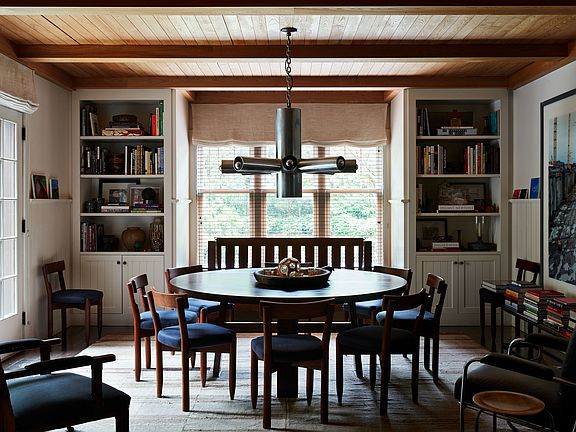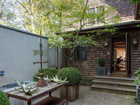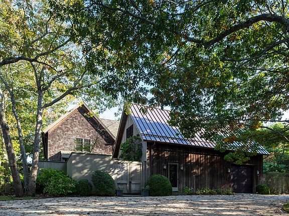 This is a rare opportunity to own a home created by a noted interior designer as his personal residence. Acclaimed Manhattan- and Hamptons-based Robert Stilin, a member of Architectural Digest's prestigious AD100, is known for marrying strong clean lines, rich warm palettes, and striking architectural details. His East Hampton home-designed in collaboration with seasoned architect Frank Greenwald-feels perfectly at home in the village, reflecting and respecting the local landscape and traditions. Inspired by vintage potato barns, the L-shaped home is a sophisticated farmhouse with a rugged cedar-shingled façade, oversized paned windows, classic shiplap-style interior paneling, a lofty pitched roof, and lush enveloping greenery. Stilin's aesthetic juxtaposes wall space for dynamic contemporary art with vintage fixtures and finishes that are simple, soulful, and strong. Fittingly, then, this home is ideal for displaying a carefully curated collection, and windows admit a gentle painterly light. While much of its style is rooted in tradition, every space is full of inventive touches, such as ceiling beams of unfinished satin-sanded ash sourced from Stilin's family's lumber company in Wisconsin, custom ebony-finished kitchen cabinet doors, grooved paneling on the living room walls, and a striking stucco fireplace outdoors. An entry courtyard with climbing vines, bluestone tiles, and a gracefully arching tree introduces the picturesque charm and inviting ease that pervades the home. Public spaces are geared toward indoor-outdoor living, with the entryway leading directly to the heart of the home, a substantial kitchen and dining area. Warm and utterly livable, the kitchen is thoughtfully outfitted with a Sub-Zero refrigerator, a butcher-block-topped island with counter seating, a farm sink, a sizeable pantry, and a stainless-steel range with two ovens, four burners, a griddle, and a grill. The formal living room is accented by a beamed ceiling and an oversized wood-burning fireplace framed in sleek unfinished ash. French doors in many spaces-the living room, the kitchen, and a nearby den with a wet bar and a three-quarter bath-open directly to bluestone-tile terraces and the serene backyard. On the upper level, the owner's suite and a similarly spacious guest bedroom and bath share a cozy, relaxing living area that offers plentiful bookshelves and a fireplace. One walk-in closet can easily be converted to a home office. The owner's bedroom is a restful retreat with hardwood floors and built-in bookshelves, while its generous en suite bath boasts dual sinks in a marble slab, a glass-walled shower, and a soaking tub set beside a sunny window-all fitted with fixtures from Waterworks. From the main level, a second set of stairs leads to a secluded guest apartment that offers visitors their own pocket of privacy, with a quiet bedroom tucked beneath the roof's pitch, a stylish three-quarter bath, and its own living space. A first-floor guest suite enjoys its own access to a backyard terrace. Life in the Hamptons, of course, is much about outdoor enjoyment, and this home accommodates that with ease. The pastoral rear grounds are kept immensely private by walls of mature greenery. It includes bluestone terraces-one with a fireplace and a minimalist water feature, another with space perfect for grilling-impeccably manicured trees and shrubs, and a refreshing swimming pool. The stucco chimney adorned with vibrant Virginia creeper vines frames the idyllic scene. The coveted south-of-the-highway location is mere minutes from ocean beaches and the restaurants and shops of the village.