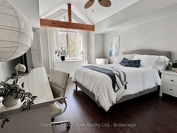 City sophistication in the center of Muskoka. This open concept modern floor plan is unique with only 3 other models like it in Grandview. Quiet top floor,(no noise over head) corner unit, loft model. 2 bedrooms each with their own ensuite. Plenty of windows to bring in the natural sunlight. "Grand view" from the private patio. Laundry off the kitchen. Master bedroom is presently in the shuttered loft or could be used for a den, office or second bedroom. Walk down a forested pathway to Fairy Lake. Swim from the dock or wade into the clear waters to kayak or canoe. This is a great place to sun & visit with your neighbors. Grandview is your gateway to Muskoka Living. Lots of Provincial parks near by. Close to town amenities including "big box" stores, boutique shops & restaurants. Surrounded by trees, rocks & water you have that cottage feel without the work ! Makes a great getaway, full time resident or income earning potential as an Airbnb. Dog & people friendly established community. Reasonable condo fees of $590/month.