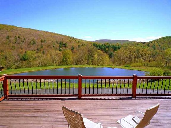 Select your favorite novel or gather friends and gaze out over the ½ acre stocked pond, lawns, fields and tennis court at the unspoiled 180o views of tree covered mountains from the spacious deck of this 4 BR Cedar home built in 1978. Tranquility and privacy on 40 acres of meadows and woodland. Formal DR and Cathedral ceiling LR w/wet bar and superb views; fireplaced family room. 30 mins to Williamstown, 50 mins to Tanglewood and Albany airport. 3 hrs to NYC. $435,000. Excellent Condition