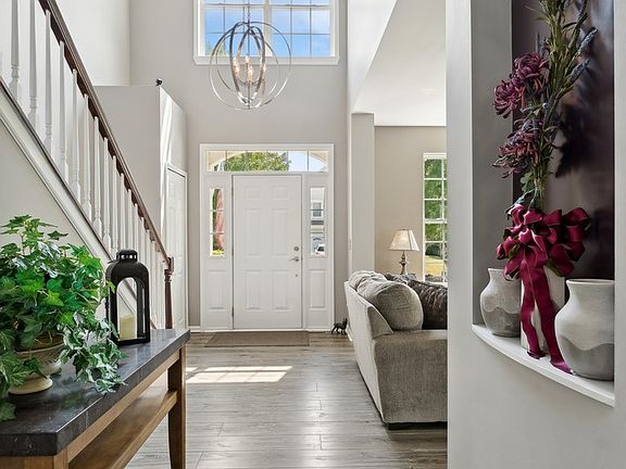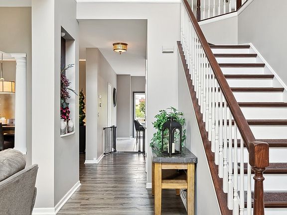 Not your average Algonquin Lakes home! This exquisite property features stunning lake views and has been thoughtfully upgraded throughout. The gourmet island kitchen is a chef's dream, boasting newer appliances and elegant finishes. A dramatic two-story family room with a custom fireplace sets the stage for comfortable living, while a large formal living and dining room offers ample space for entertaining. Newer LVP flooring on the first floor and fresh paint throughout add a modern touch. Convenient first-floor laundry and a den/office with amazing lake views enhance the practicality of this home. The large primary suite is a true retreat, featuring a tray ceiling, an extra window to enjoy the lake views, his and her walk-in closets, and a luxurious bath. The princess suite includes its own private bathroom, while bedrooms three and four share a Jack-and-Jill bath, ensuring comfort and privacy for all. A spacious loft provides a great second office area. The walkout, partially finished basement with 9-foot ceilings includes a rec room, roughed-in bath, and ample storage, offering endless possibilities for customization. Outdoor living is equally impressive with a covered concrete patio, invisible fencing, and an oversized deck perfect for soaking in the breathtaking lake views. Enjoy all that Algonquin Lakes has to offer, including biking and walking trails, three lakes, a park and playground, frisbee golf, and an elementary school. This one-of-a-kind property is move-in ready and waiting for you to make it your own. Don't miss the opportunity to own this spectacular Algonquin Lakes home with stunning lake views!
