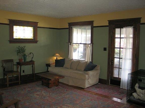 This home offers an open first floor featuring original woodwork, gas fireplace, formal dining room and stained glass windows. Upstairs you will find a newly renovated bathroom and two huge closets in both bedrooms. Outside you can relax on your covered front porch with a skyline view or your fenced in backyard with multiple garden beds.
