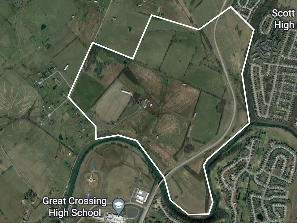 Rapidly growing Georgetown area 503 +/- acre farm, which has been in the family since 1849, is now being offered for sale. This land, currently being used for crop and cattle, sits just North of Great Crossing High School and has an amazing 1.4 miles of frontage along McClelland Circle (460 Bypass). Additionally, this farm has 1.6 miles on frontage along the North Elkhorn Creek. Part of the farm also adjoins Derby Estates neighborhood. (Contact GMWSS for details about water and sewer access). Zoned agriculture, a portion of the farm is in the Urban Service Area as Urban Residential, part is Rural Residential (Contact Scott Co. P and Z for details).