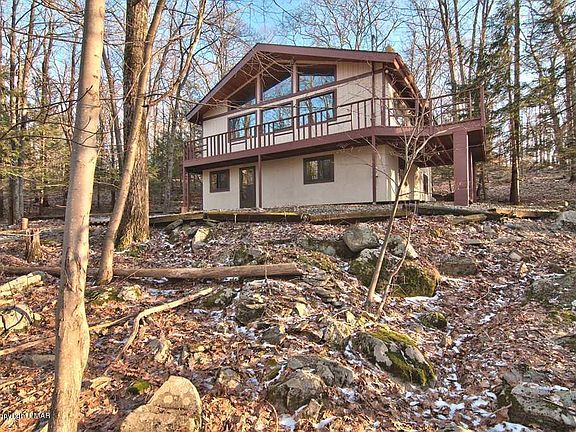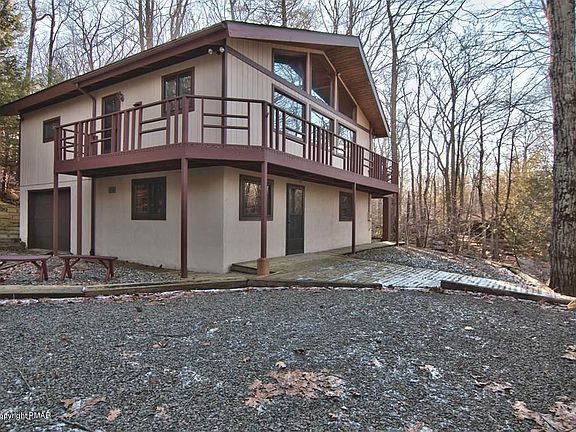 Perfect peaceful setting. The open floor plan makes this home a superb opportunity for the mountain dweller who loves natural light. Beautiful tongue and groove ceilings with exposed beams in the main living area with a gorgeous floor-to-ceiling stone fireplace as the main focal point of the living room. Other features of this home include 2 bedrooms, a full bathroom, partially finished basement with additional room for storage or to finish and expand, expansive decking, and a 2 car garage! This home includes access to a 75 acre lake great for bass fishing, tennis courts, beach area, and pavilion. Close to all other Pocono area attractions. Wonderful home at a wonderful price! Being sold fully furnished!
