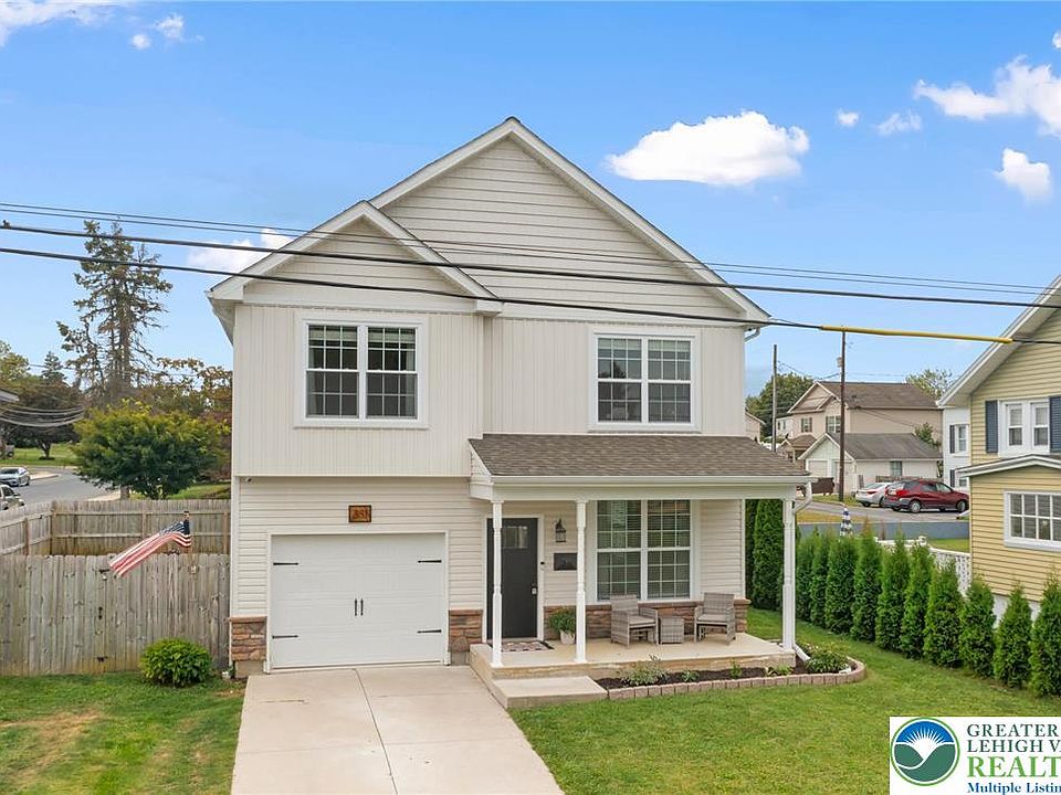 Welcome to this modern 3-bedroom, 2.5-bath detached home built in 2019 with quality 2x6 construction, stylish finishes, and an ideal Emmaus location. The open-concept main level is designed for today’s lifestyle, featuring a bright living room with fireplace feature wall, a dining area filled with natural light, and a gourmet kitchen with white cabinetry, granite countertops, stainless steel appliances, pantry, and center island seating. A convenient powder room and attached garage complete the first floor. Upstairs, retreat to the spacious primary suite with vaulted ceiling, walk-in closet, and private bath with double vanity. Two additional bedrooms share a full hall bath, and a second-floor laundry room with sink adds everyday ease. Outside, enjoy a welcoming covered front porch plus a fully fenced backyard with patio — perfect for entertaining or relaxing evenings. Located just blocks from parks, shops, restaurants, and schools, this home blends modern comfort, durability, and small-town convenience. *BUY WITH CONFIDENCE—PRE-LISTING HOME INSPECTION AVAILABLE * 3D MATTERPORT PLUS INTERACTIVE FLOOR PLAN AVAILABLE, TOO TOO*