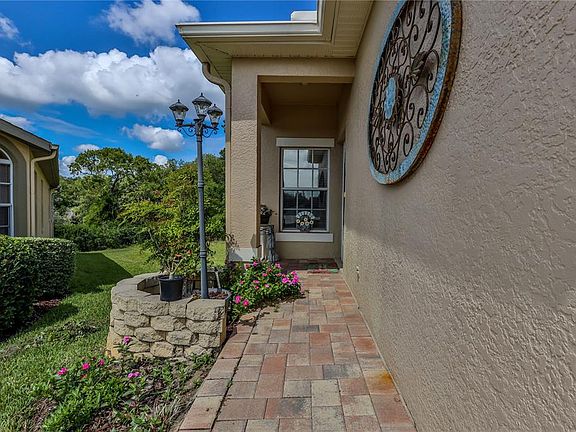 3/2/2 Plus Den. Patiio home located in this upscale 55+ Community features 1,819 sq. ft. of living space. Home situated on wonderful lot. Paved Driveway & walkway leads to foyer with tile flooring with marble in-lay. Kitchen features 42'' maple wood cabinets, with all self closing drawers and pullout shelves. Beautiful Walk-in Pantry for convenience & Granite counters in kitchen and baths. SS appliances, laminate flooring in main living area. Plantation Shutters in many rooms. Enclosed lanai with glass windows, tile flooring offers much more interior space. Opens out to the newer open deck to enjoy the treelined view. Split Plan with high flat ceilings. Master is very large & master bath has has double vanities, custom bath cabinets, lighting and walk-in shower. Huge closet in master with custom closet system. Secondary bedrooms are good sized, large indoor utility room with cabinets and laundry tub, includes washer & dryer. Screen door in addition to door to garage to let in air. & light. Upgraded Cabinetry in Garage for extra storage, and water filter & softener. Electronic screen on garage too! HOA installing new roof in 2022 and exterior painted in 2021,. Home is immaculate and cared for This upscale 55+ community just 45 minutes from Tampa. Community has 24 hour guard, Community Pool, Spa, Restaurant, Fitness, Library, Billiard, Bocce, Tennis & Pickle Ball. Basic Cable & Internet Included. Included in the Patio Maintenance: lawn care, sprinkler maintenance, exterior painting. Cable, & Internet. No fences permitted. All room dimensions are approximate.