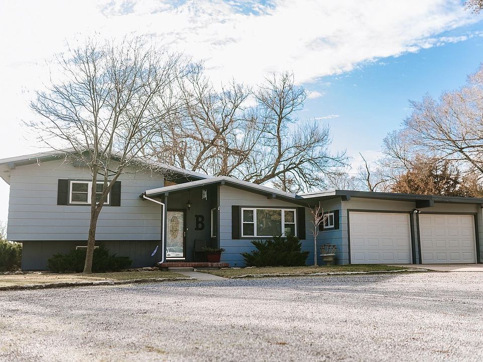 This country setting property & home is dreamy and sits on 1.15 acres!! The updates can be found from the outside, all around and inside throughout the home! Enter the property off of a black top road only 1/2 mile North of Hwy 50 off of Halstead Rd; just minutes from Wichita, Hutch & Newton! The property is lined with huge mature trees and the driveway opens up to a large circle parking area. The metal roof on the home was done 2 years ago and has a lifetime guarantee, exterior paint is in the last 5 years and the landscaping around the property is meticulous and very well maintained! The back of the property has a nice patio area, with a covered area for the grill, a firepit area and a parklike feel! There is a 32x30 barn/shop with a 12x18 lean-to, an 8x10 shed & a 12x8 barn. The home features all the updated colors and amenities including an oversized, attached 2 car garage! Walking through the front door you will enter the very spacious living room with beautiful ceiling beams! From there you find an adorable galley kitchen with a ton of new cabinet faces & hardware, plenty of counter space, with new countertops and a custom eating bar! Take 1 step down to the formal dining area, and down the short hallway to a 1/2 bath with toilet and sink, where you will enter the master bedroom with 2 closets and a ton of space! Just a few steps to the upper level you'll find 2 very spacious bedrooms and a large full bathroom with a lot of storage. The full bathroom and 1/2 master bath have been updated throughout! Now just 8 steps down to the lower level you'll find the very large family room, walk out basement door leading to the backyard and a laundry room equipped with a stand up shower and sink! The house is FULLY electric! It doesn't get better than this!