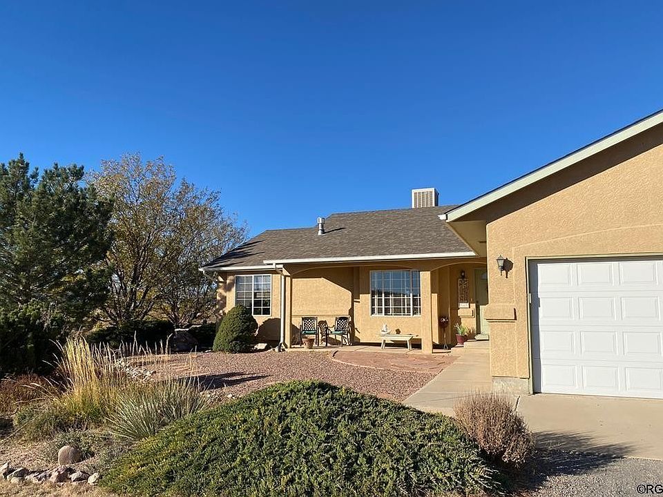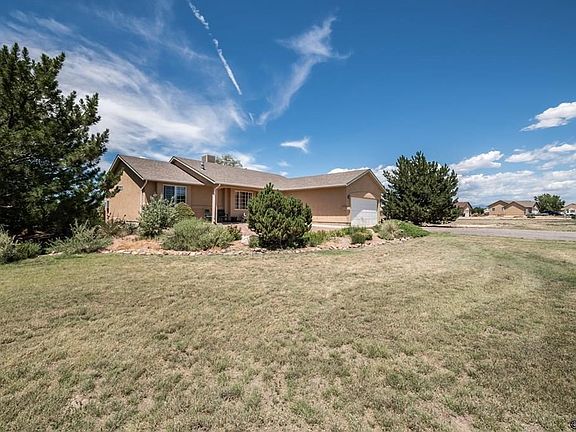 Welcome HOME to grand mountain views and spectacular sunsets, especially from the covered patio of this immaculate, turnkey 6 bedroom, 3 bath Ranch home with 2-car attached garage plus a large workshop. Enjoy privacy galore on 1.01 acres of professionally landscaped outdoor space, including flowers, bushes, mature trees, and gardens with a sprinkler system and fence, as well as a stone path leading to a firepit and pole building. Surrounded by Pueblo West Metro-land, protecting your mountain view! Plenty of space for your toys and projects including a workshop, electricity 110/220V, and a concrete floor. Main level has a spacious living room with a gas fireplace open to the dining room, hardwood floors, and a sliding door conveniently connecting to the covered patio for al fresco dining. Kitchen overlooks the backyard and mountains and features beautiful granite countertops and updated appliances. Furnace and evaporative cooler were replaced in 2020. Enjoy privacy with a split bedroom plan. Primary suite has sliding doors with a mountain view and a recently updated en suite featuring tiled walk-in shower, double sinks, and 2 walk-in closets. Two additional bedrooms, a full bath and main floor laundry plus 3 bedrooms, a full bath, and family room in the lower-level offer abundant storage and flexibility in sleeping, office, craft, exercise, gaming, and guest spaces according to your needs. Schedule your showing today!