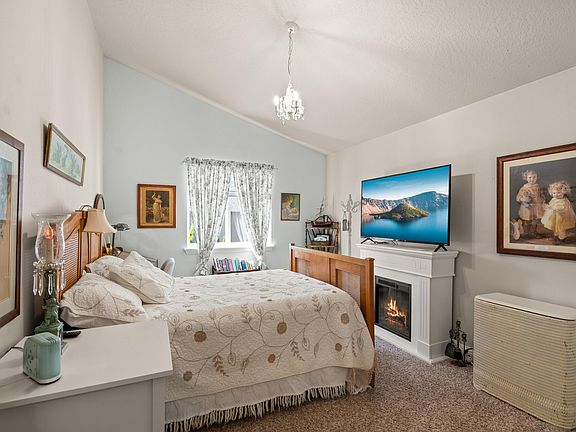 Welcome to River Road Estates, known for its quiet streets, safety, and walkability. This neighborhood is a favorite for dog lovers and active lifestyles, with sidewalks and nearby Reinhart Volunteer Park offering sports fields, trails, playgrounds, and direct access to the Rogue River and walking bridge. The 2-story home features a main-level primary suite with walk-in closet and en suite, an inviting kitchen with solid wood cabinetry, stainless appliances, and bar seating, plus vaulted ceilings in the open living area overlooking the freshly sodded, manicured yard. The new HVAC(2025), new carpet, and fresh paint ties it all together. The upstairs adds two bedrooms, a full bath, and versatile landing. French doors open to a covered porch perfect for indoor-outdoor living. A versatile outbuilding has served as storage and even a chicken coop. With a 2-car garage and easy access to town, this home blends privacy, convenience, and lifestyle.