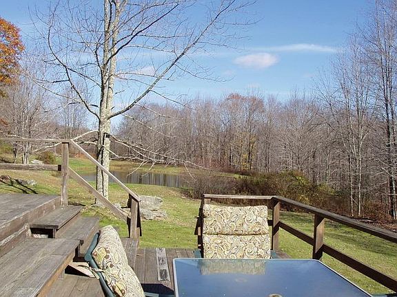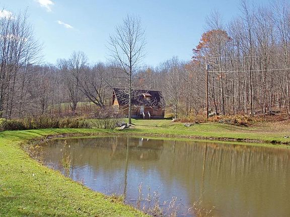 PEACE, POND & PRIVACY - Absolutely charming chalet nestled in on completely private 6 acres in the Pepacton Reservoir area. Multi-level deck overlooks spring-fed swimming pond. Spacious, sunny living area with contemporary interior finish, soaring ceilings, skylight, exposed beams, wide-plank pine floors, and front window wall with sliders opening to the sundeck. Wrought iron and oak curved staircase with dormer window overlooking the pond. Large master sleeping loft with full dormer and half bath. Two bedrooms and full bath on main floor. Easy drive to Andes or Margaretville. Hiking, recreational boating, fishing, skiing, golf and more just 2.5 hours from GW Bridge.
