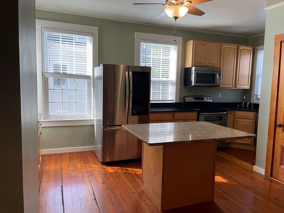 Large 2 bedroom, 1.5 Bath in downtown Newport with granite countertops, stainless steel appliances, wood floors, high ceilings. Enclosed stone patio, 1 off street parking spot, washer/dryer in basement; across street from park/library. Renter pays for all utilities: gas, elect, water, internet. No smoking. Dogs ok; no cats are allowed. Long term (12 months minimum) rental
